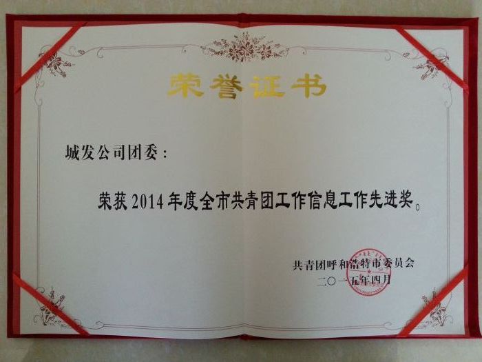 201543,在共青團呼和浩特市十六屆二次全委(擴大)會暨少工委五屆五次全委(擴大)會議上,城發(fā)公司團委榮獲“2014年度全市共青團工作信息工作先進獎”。