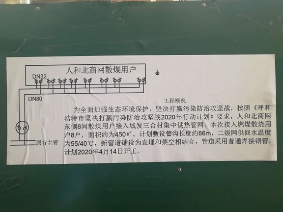 按照《呼和浩特市堅決打贏污染防治攻堅戰(zhàn)2020年行動計劃》總體要求,該項目接入燃煤散燒用戶42戶,面積約2450平方米,其中一家村豐州路西34戶,2000平方米;人和北商網(wǎng)8戶,450平方米。該項目計劃敷設(shè)管線溝槽長度約174米,其中一家村豐州路西為88米,人和北商網(wǎng)為86米。新管道鋪設(shè)以直埋和架空相結(jié)合的方式,全部采用普通焊接鋼管,開工時間為2020年4月14日。