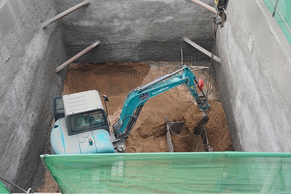 9月24日上午,筆者遠遠看到一吊車正將坑內挖掘的土方吊起,走近作業(yè)坑,看到坑內小型挖掘機正在開挖土方,還有2名施工人員正在進行鋼筋網片的焊接。